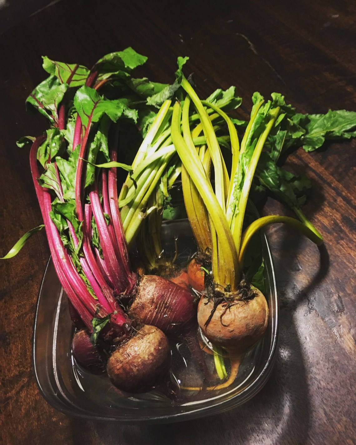 Bought one bunch beets(next time I may buy 2) from the organic section at Kroger. Uncleaned & refridgerated, they keep 2-4 weeks. Otherwise, we made them right away. You can use the chard, but this time we composted it.