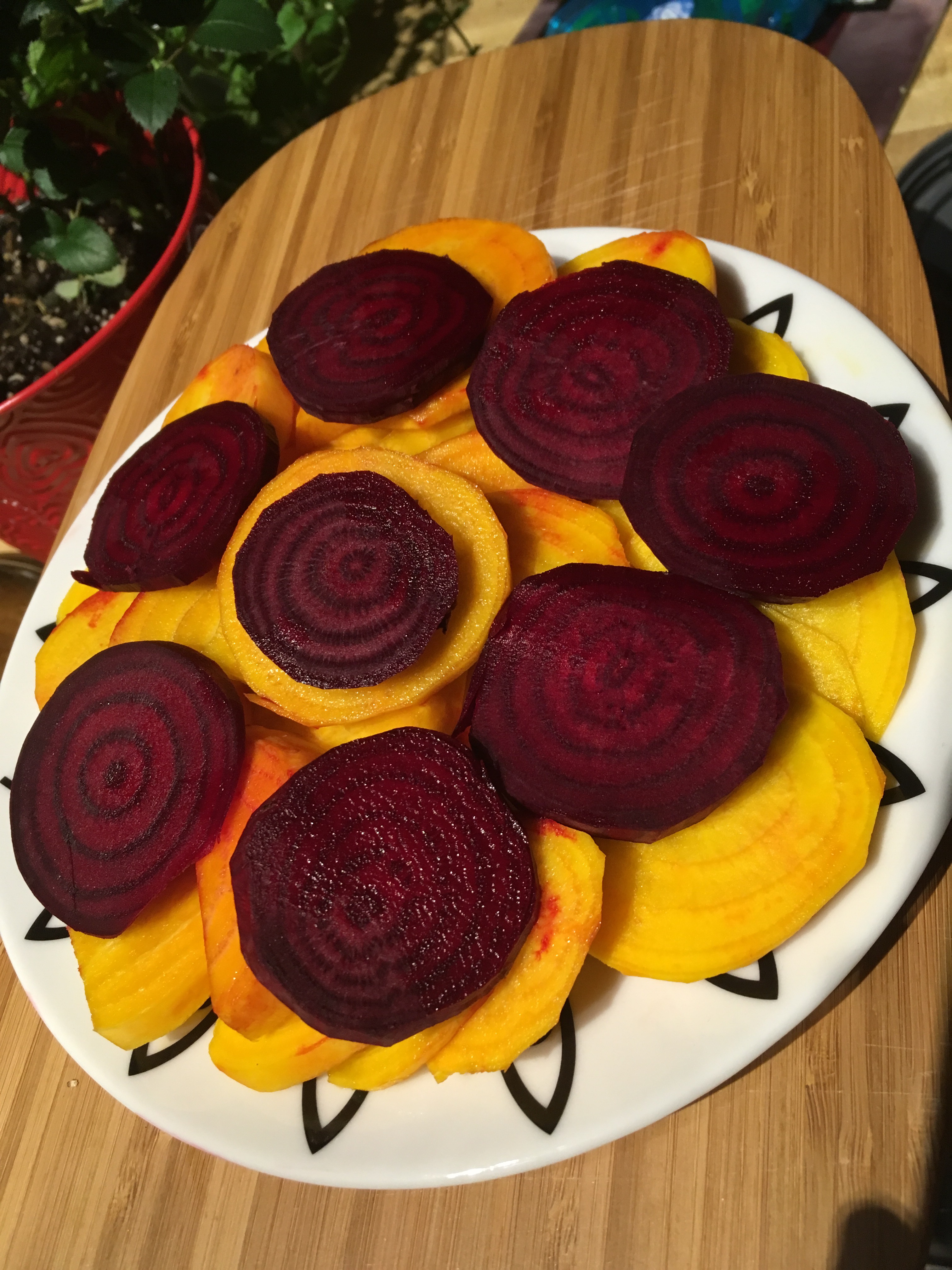 I peeled the beets using a veggie peeler. Then, it’s up to you how you would like to slice. I tried to slice mostly thin discs.