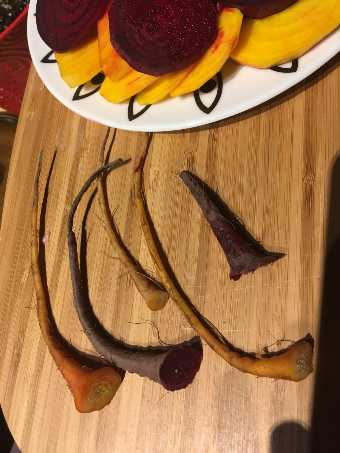 I broke off the tops & trimmed the “tails” I told Alva, my 4yr old son and assistant, that they were Mouse or Dragon tails!! 😂 He got a kick out of playing with them & cutting them. I did not blanch, boil or bake them because we wanted crispier beets. But, if you like the softer kind, you can add this step.