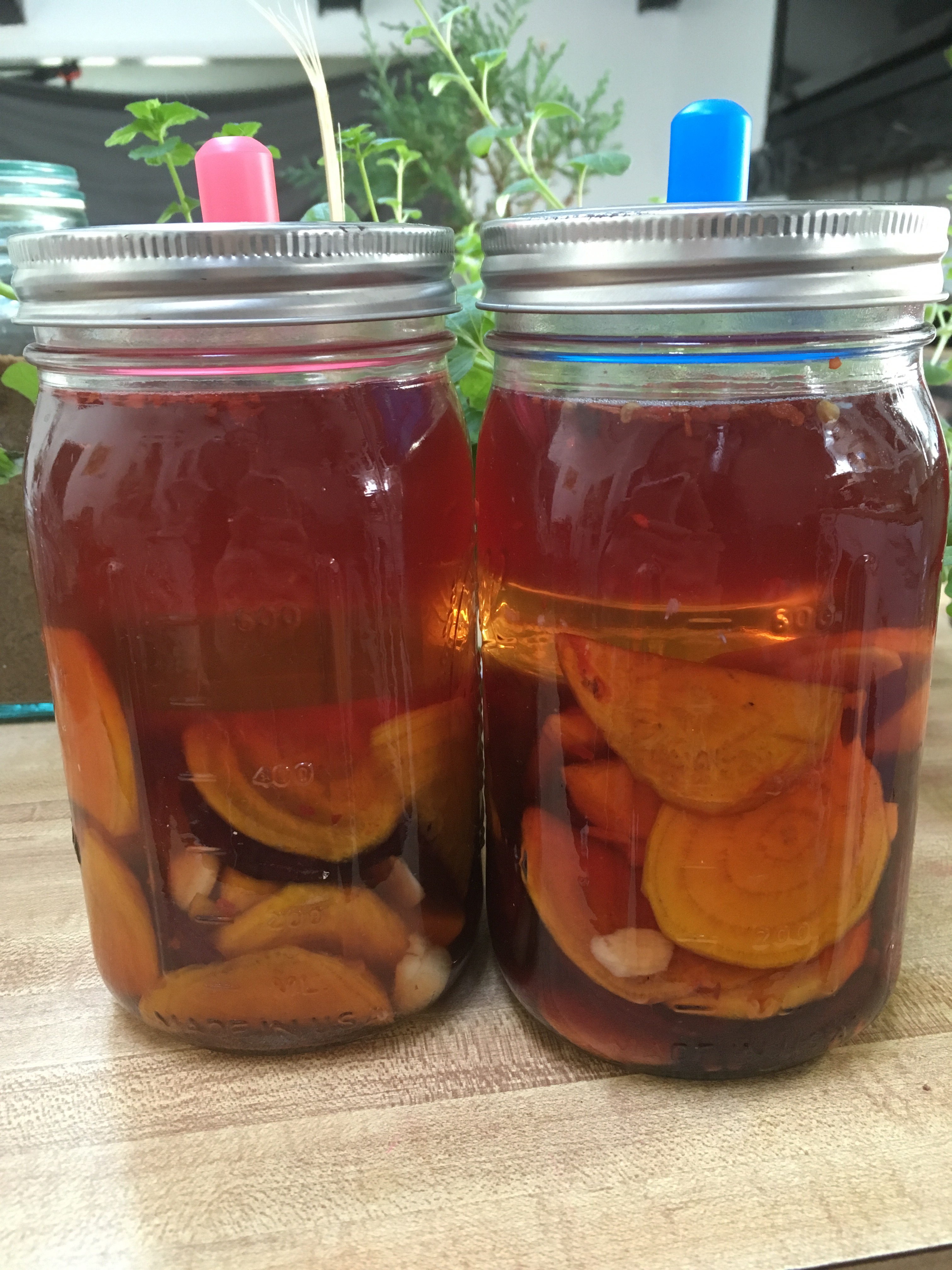 We put the glass pickle pebble weight on top and the silicone pickle pipe. Now we will ferment for 2-3 weeks and I will update with photos and reviews! Keep your jars in a dark, warmer place. It’s my first time making pickled beets🤗ps. Use tape w a date or write on your calendar so you can keep track.