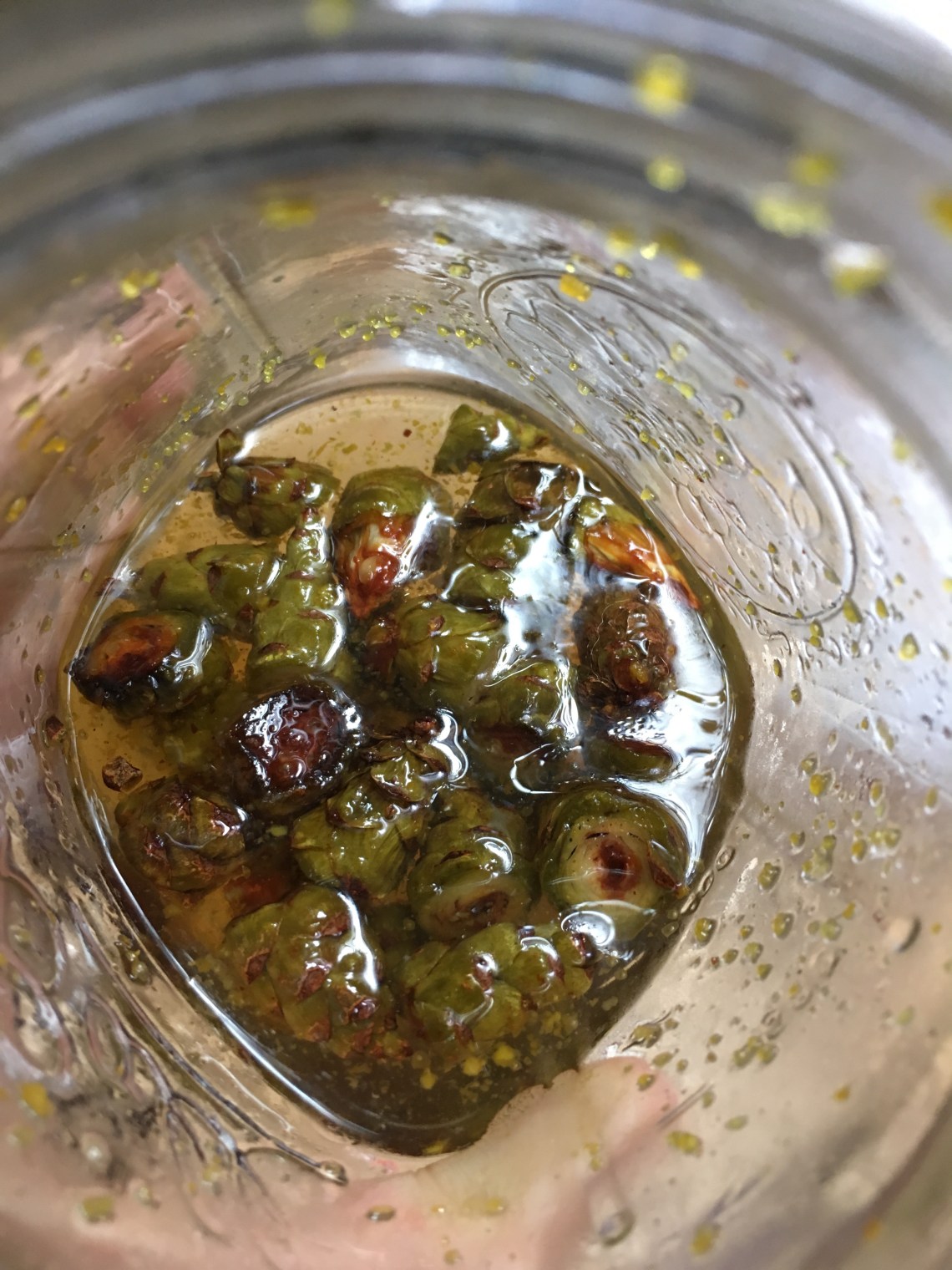 Next, Cut your green pinecones into 3 to 4 pieces. Then, pour your boiling water sugar mixture over your pinecones into a glass mason jar.