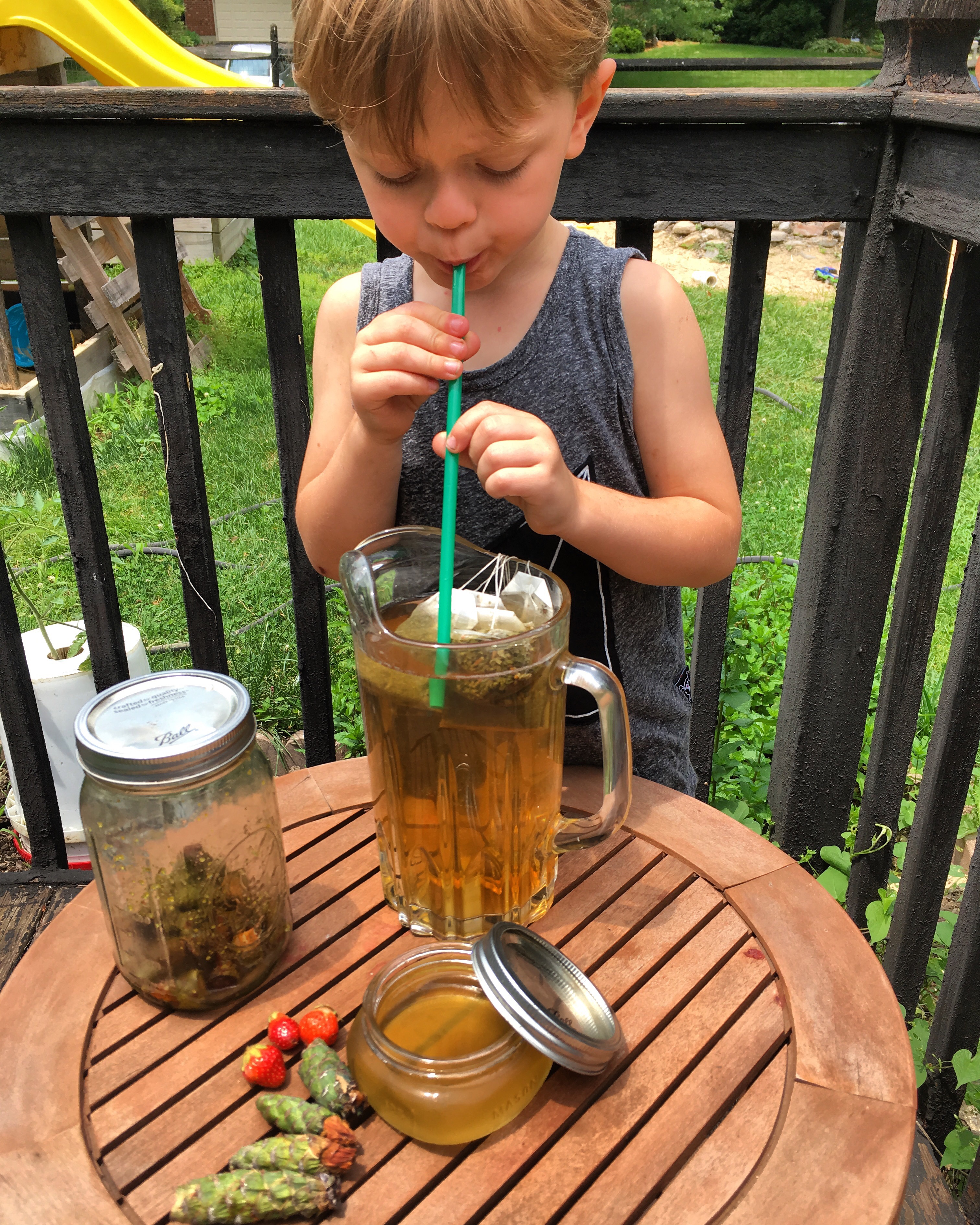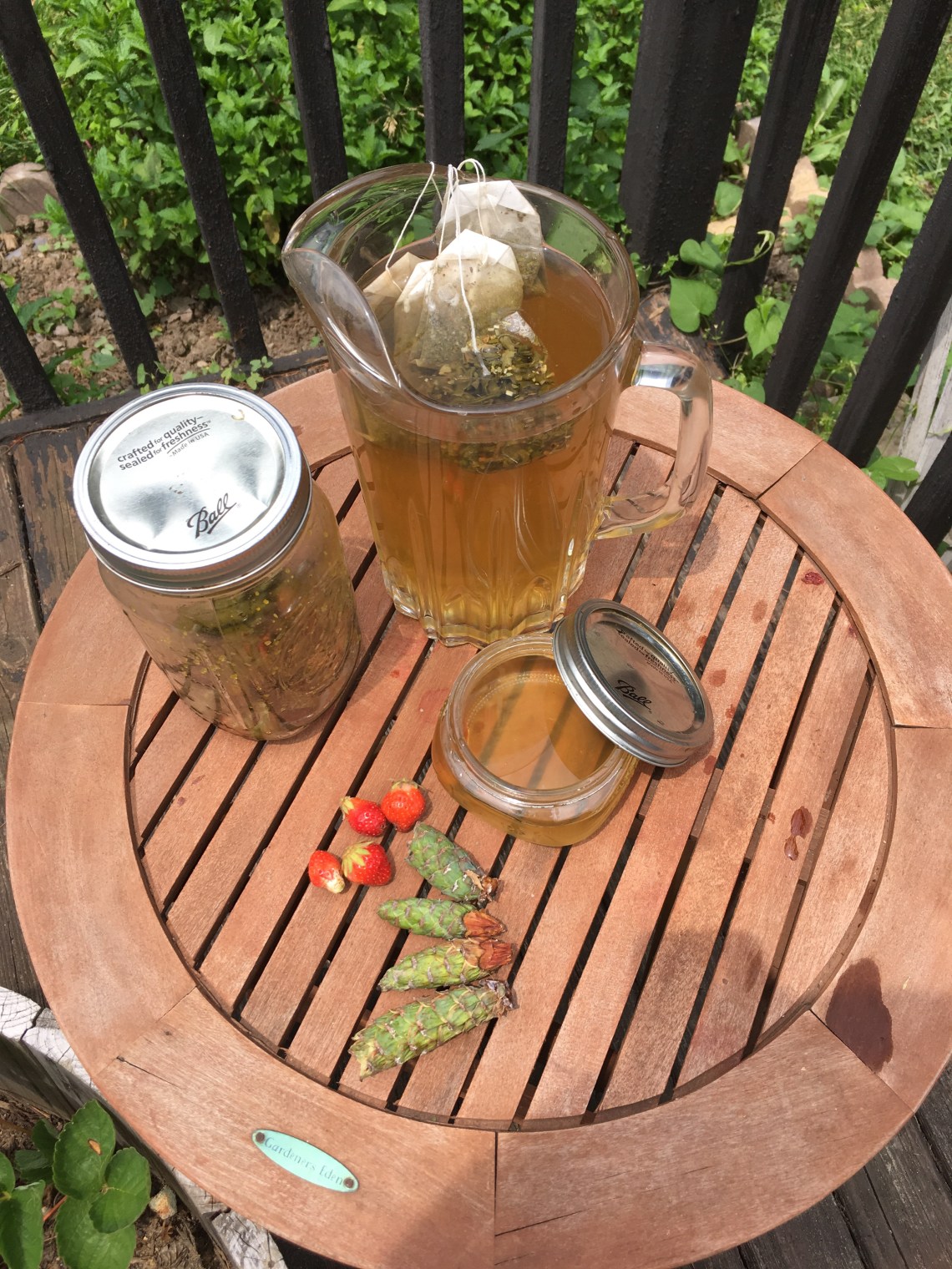 Strain your syrup & can freeze for pops when you’re sick, as an immune booster. I added the syrup to my sun tea. Use your syrup anywhere you could normally use maple. At first the pinecone scent is strong, but after a few days the orange zest mixes with the syrup and it becomes a really sweet flavored orange syrup!