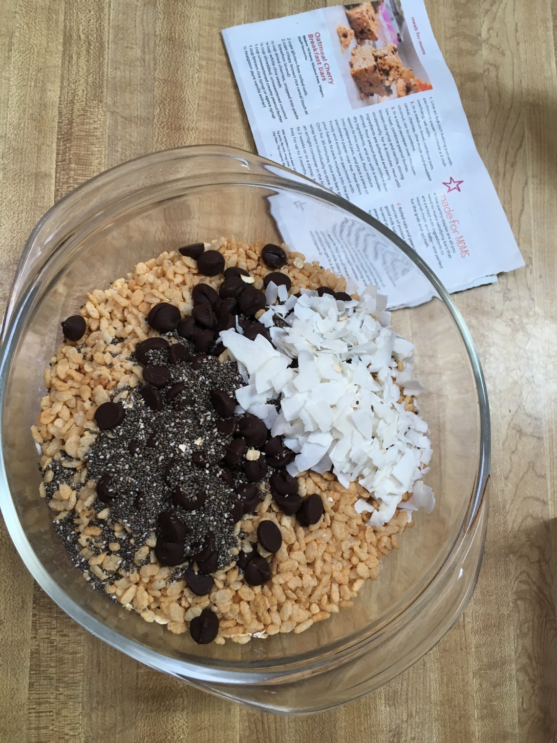 In a medium bowl, combine oats, cereal, raisins, Chia seeds and shredded coconut; stir to combine.